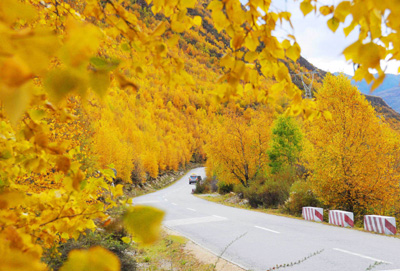車輛行駛在秋日里的川藏公路西藏林芝地區境內,川藏公路林芝境內被譽為最美景觀大道