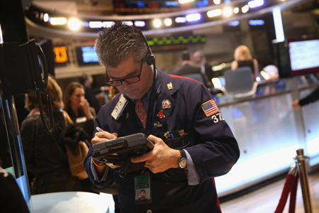 1月13日,一名交易員在美國紐約證券交易所工作。 由于投資者在美國大銀行財報公布前拋盤離場,紐約股市三大股指13日下跌。截至當天收盤,道瓊斯工業平均指數比前一個交易日跌179.11點,收于16257.94點。標準普爾500種股票指數跌23.17點,收于1819.20點。納斯達克綜合指數跌61.36點,收于4113.30點。
