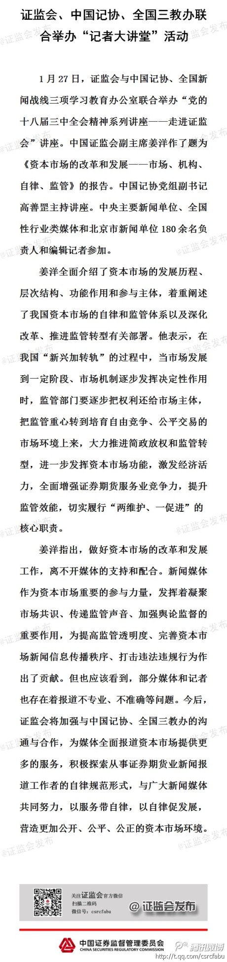 據證監會微博消息,1月27日,證監會、中國記協、全國三教辦聯合舉辦“記者大講堂”活動,證監會副主席姜洋表示,證監會將加強與中國記協、全國三教辦的溝通和合作,為媒體全面報道資本市場提供更多服務,積極探索從事證券期貨業新聞報道工作者的自律規范形式,與廣大新聞媒體共同努力,以服務帶自律,以自律促發展,營造更加公開、公平、公正的資本市場環境。