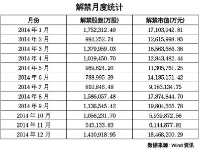 WIND統計數據顯示,從解禁情況來看,2014年全年,A股開始流通的股數將達到1344.83億股,解禁市值合計將達到1.62萬億元,這個解禁市值,雖然較2013年全年有所降低,但從2010至今的情況來看,則仍然處于高位。其中,僅首發原股東限售股份的解禁就達到了669.84億股,解禁市值高達9630億元。