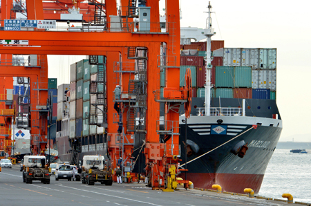 日本10日公布的數據顯示,受巨額貿易逆差拖累,2013年日本國際收支經常項目順差額創歷史新低,為3.3061萬億日元,比前一年減少31.5%。數據還顯示,經季節調整后,2013年12月日本國際收支經常項目出現1967億日元逆差額,為連續4個月出現逆差。圖為10日在日本東京的一個貨運碼頭,貨輪正在裝載貨物。