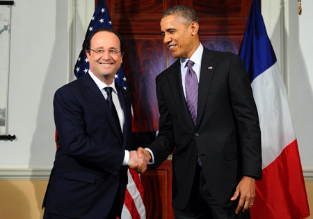 法國總統奧朗德10日開始對美國進行為期三天的國事訪問,希望加強兩國的商業合作,提振法國經濟。美國總統奧巴馬和奧朗德10日聯合撰文強調,美法兩國正在深化經濟關系,美國和歐盟正在進行的"跨大西洋貿易和投資伙伴關系協定"談判,將促進雙邊貿易、就業和出口。圖為當日奧巴馬(右)與奧朗德在參觀美國弗吉尼亞州夏洛茨維爾的美國第三任總統托馬斯·杰斐遜故居后握手。