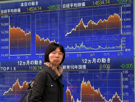 受投資者采取獲利回吐操作以及日元對美元匯率小幅反彈等因素影響,13日日本東京股市低開低走,日經225種股票平均價格指數收于14534.74點,比前一個交易日下跌1.79%。國際貨幣基金組織官員13日表示,近期投資者大量拋售日本股票,這反映出市場對“安倍經濟學”的憂慮,日本應盡快啟動根本的改革措施,比如減少公共債務規模。 圖為行人在東京經過一塊電子顯示牌。
