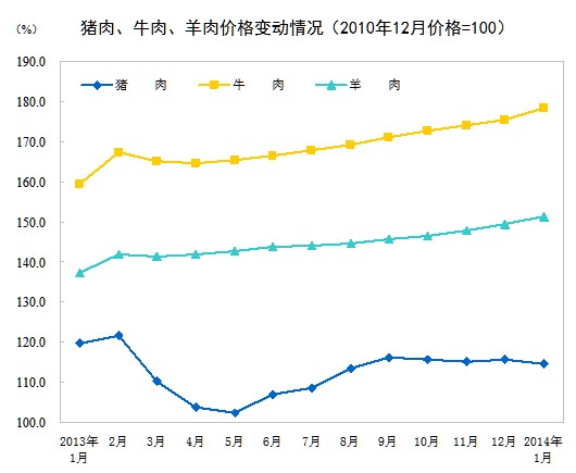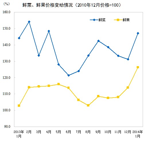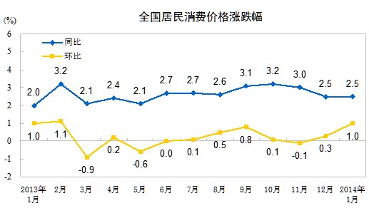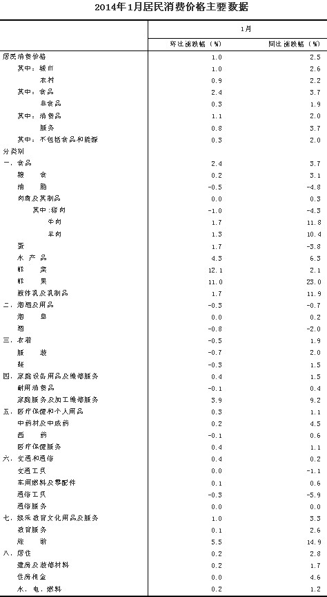 2014年1月份,全國居民消費價格總水平同比上漲2.5%。其中,城市上漲2.6%,農村上漲2.2%;食品價格上漲3.7%,非食品價格上漲1.9%;消費品價格上漲2.0%,服務價格上漲3.7%。