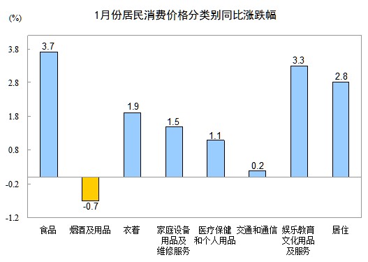 1月份,非食品價格環比上漲0.3%。其中,娛樂教育文化用品及服務、家庭設備用品及維修服務、交通和通信、醫療保健和個人用品、居住價格分別上漲1.0%、0.4%、0.4%、0.3%和0.2%,衣著、煙酒及用品價格分別下降0.5%和0.3%。