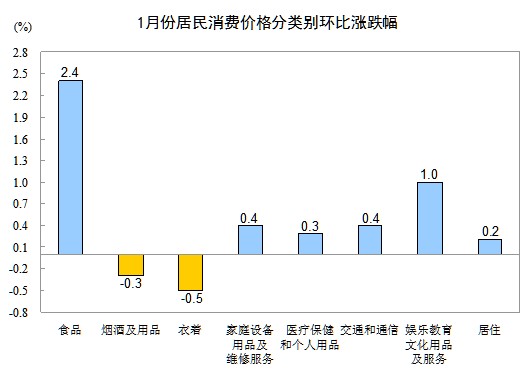 1月份,全國居民消費價格總水平環比上漲1.0%。其中,城市上漲1.0%,農村上漲0.9%;食品價格上漲2.4%,非食品價格上漲0.3%;消費品價格上漲1.1%,服務價格上漲0.8%。