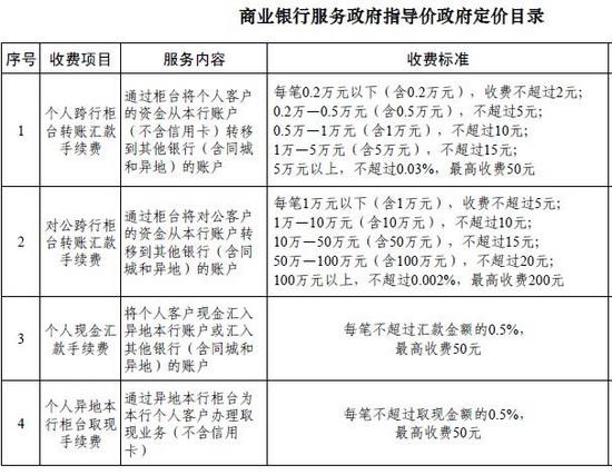 根據發展改革委、銀監會公布的《關于印發商業銀行服務政府指導價政府定價目錄的通知》,商業銀行為銀行客戶提供的基礎金融服務實行政府指導價、政府定價管理,包括部分轉賬匯款、現金匯款、取現和票據等服務項目,具體收費項目和標準按《商業銀行服務政府指導價政府定價目錄》執行。