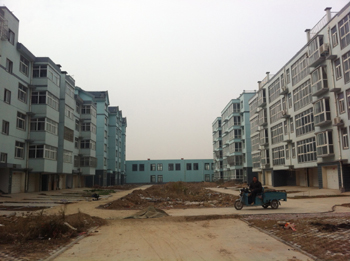 然而,記者在河南新鄉市紅旗區看到了另外一番景象。關堤鄉油坊堤村共有2800多人,2009年動工興建名為和旺社區的新村,至今已完工多時。但記者在現場發現,偌大的新社區連個院門都沒有,從外面沿著一條水泥路進來,約有10多棟5層高的樓房,多數都空無一人。樓房之間的空地上,有的種著蔬菜,有的是荒草和建筑垃圾,甚至還能看到尚未收獲的莊稼。