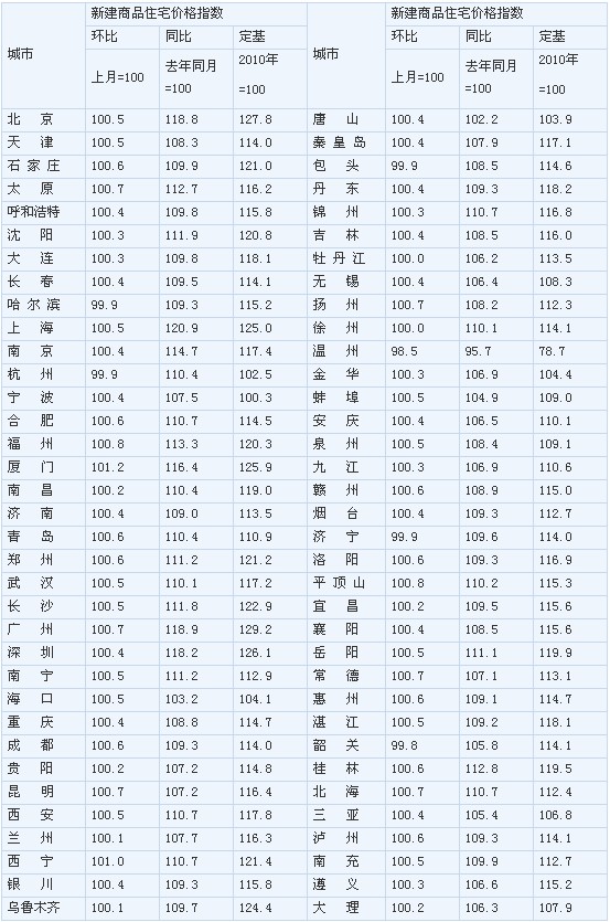 表:2014年1月70個大中城市新建商品住宅價格指數