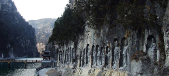 站在雙姑峰上朝下一望,竟然發現了新的景點。寺后下面風光綺麗,湖色優美,碧波蕩漾,湖面上游客乘坐快艇,艇后泛起白色浪花。一尊漢白玉觀世音菩薩佛像6米多高,亭亭玉立在湖面中央。對面的山崖下,開鑿了許多石刻佛像。如此有這般好風景,不由令人加快腳步走下坡底。過了天橋,走到對岸,觀看了湖面兩岸雕刻的個性鮮明、形態逼真的216尊佛教摩崖造像。