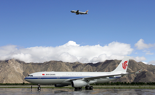 國航西南分公司空客A330飛機抵達拉薩貢嘎機場(空中為國航空客A319飛機起飛)
