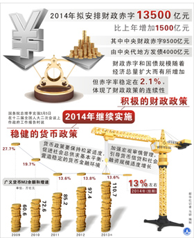 3月5日,受國務院委托,財政部向十二屆全國人大二次會議提請審查預算報告,報告包括2013年中央和地方預算執行情況與2014年中央和地方預算草案。報告顯示,2013年財政預算執行情況總體良好。2014年全國財政收入增長預計8%,赤字率將保持在2.1%。