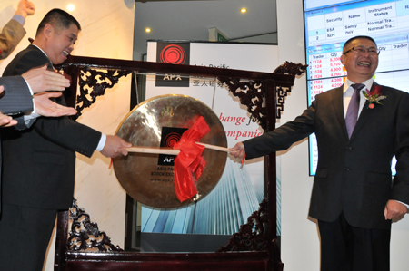 3月6日,澳大利亞生命力控股集團董事長陳良超(右)與中環運控股集團董事長曹友共同敲鑼,宣布兩家公司在亞太證交所上市。 當日,澳大利亞亞太證券交易所在悉尼舉行敲鑼儀式,兩家中資背景的公司也于當日在這里正式掛牌上市,標志著這家由華人金融企業全資持有的證交所正式開始運行。