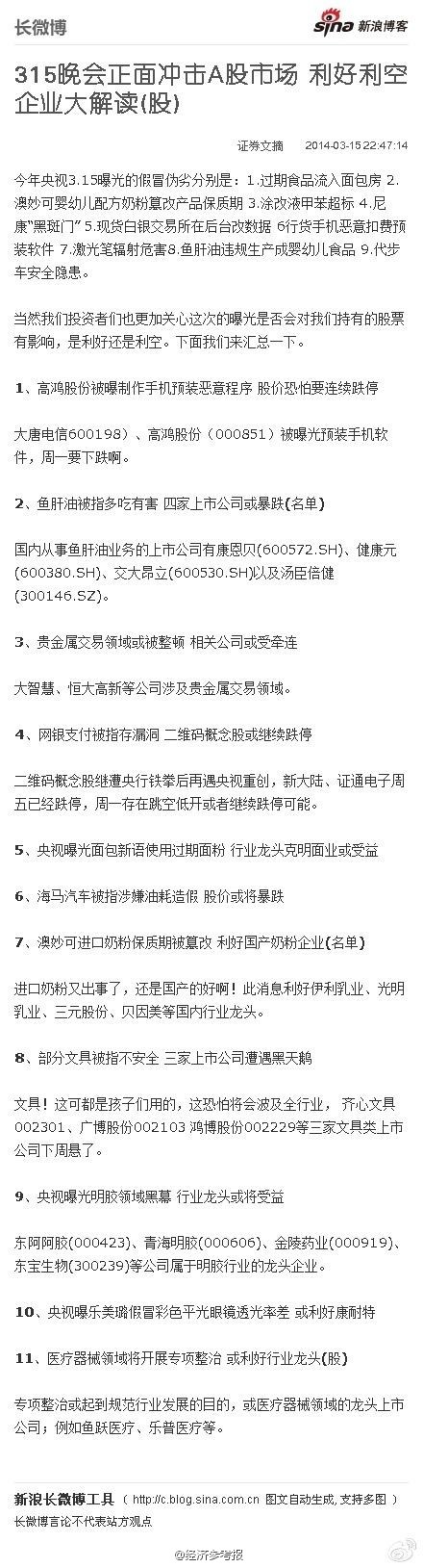 315晚會正面沖擊A股市場 利好利空企業大解讀