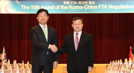 中韓自由貿易協定(FTA)第十輪談判17日至21日在韓國京畿道一山開幕,中國商務部部長助理王受文和韓國產業通商資源部審議官禹泰熙分別率中韓代表團出席會議。本輪談判將主要商討雙方開放市場的程度,中韓雙方將就貨物貿易、服務貿易、投資、原產地規則、貿易救濟、技術性貿易壁壘、衛生和植物衛生措施、知識產權等廣泛領域展開磋商。 圖為王受文(右)和禹泰熙在談判前握手。