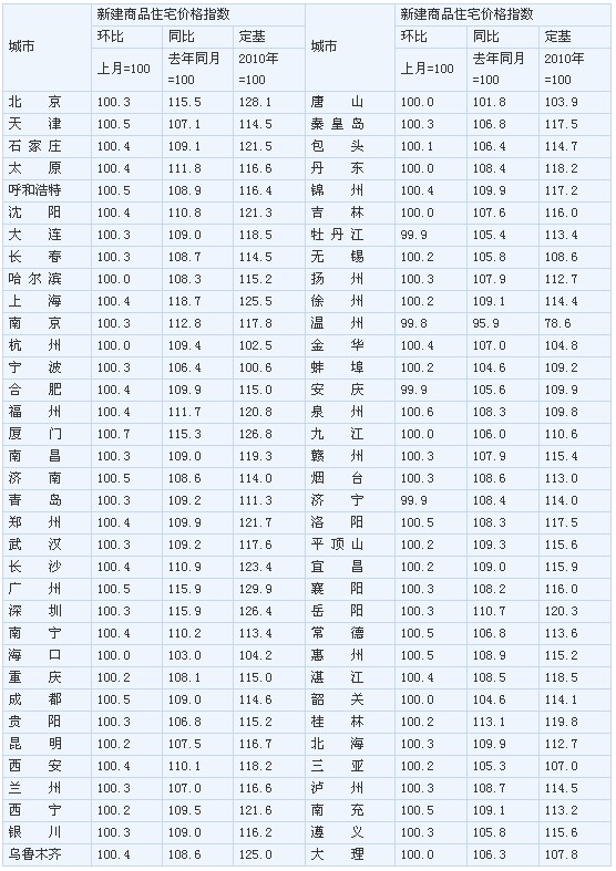 與去年同月相比,70個大中城市中,新建商品住宅(不含保障性住房)價格下降的城市僅有溫州1個,上漲的城市有69個。2月份,同比價格變動中,上海漲幅最高為18.7%,最低為下降4.1%。