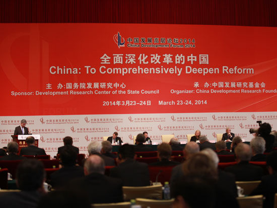 “中國發展高層論壇2014”于3月22日-24日在釣魚臺舉行。上圖為《對話會一:應對過剩產能》論壇現場。