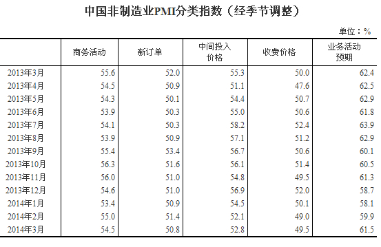 2014年3月,中國非制造業商務活動指數為54.5%,高于榮枯線4.5個百分點,但比上月回落0.5個百分點。