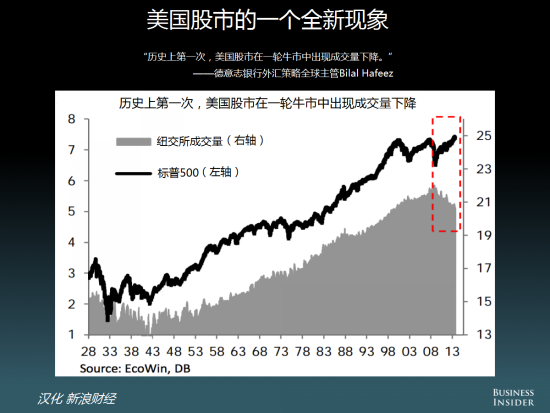 “歷史上第一次,美國股市在一輪牛市中出現成交量下降!薄乱庵俱y行外匯策略全球主管Bilal Hafeez