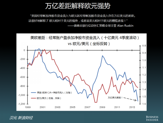 “美國經常帳加凈股市資金流入與歐元區經常帳加股市資金流入存在萬億美元的差距。這很好地解釋了歐元相對于美元的強勢,或者說美元相對于歐元的糟糕表現!”——德意志銀行G10外匯策略全球主管Alan