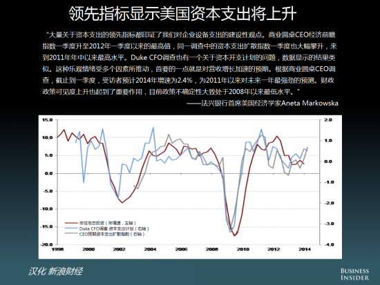 CFO調查也有一個關于資本開支計劃的問題,數據顯示的結果類似。這種樂觀情緒受多個因素所推動,首要的一點就是對營收增長加速的預期。根據商業圓桌CEO調查,截止到一季度,受訪者預計2014年增速為2.4%,為2011年以來對未來一年最強勁的預測。財政政策可見度上升也起到了重要作用,目前政策不確定性大致處于2008年以來最低水平!薄ㄅd銀行首席美國經濟學家Aneta