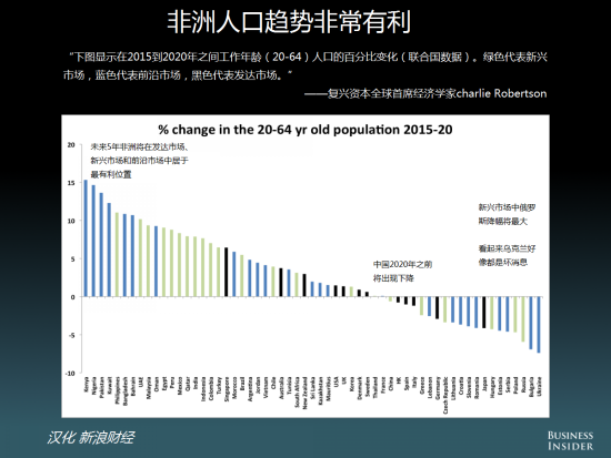 “下圖顯示在2015到2020年之間工作年齡(20-64)人口的百分比變化。綠色代表新興市場,藍色代表前沿市場,黑色代表發達市場!薄獜团d資本全球首席經濟學家charlie