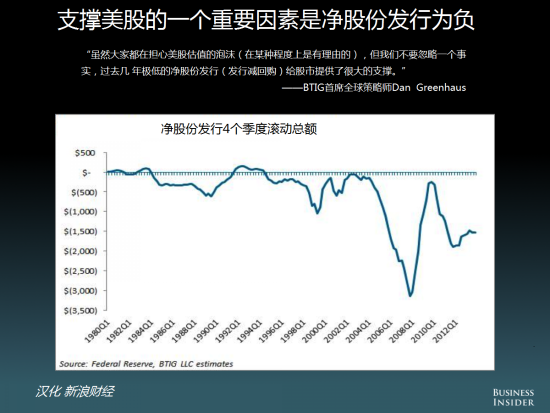 “雖然大家都在擔心美股估值的泡沫(在某種程度上是有理由的),但我們不要忽略一個事實,過去幾年極低的凈股份發行(發行減回購)給股市提供了很大的支撐!薄狟TIG首席全球策略師Dan