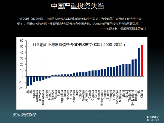 “在2008-2012年間,中國私人債務占GDP比重激增53個百分點,為全球第二大升幅(僅次于盧森堡)。香港債務的大幅上升很可能大部分都來自中國大陸。這意味著嚴重的投資不當和壞賬風險!薄楞y美林中國股市策略主管崔偉