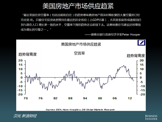 “最近美國住房空置率(包括出租和自住)的趨勢意味著房地產泡沫時期積累的大量空置房已經完全消化。只要住宅投資依然維持在最近的歷史低位(占GDP比重),尤其是家庭形成速度回歸到與潛在人口增長更一致的水平,空置率下降的趨勢還會延續下去。這意味著住宅建設還將繼續成為增長的引擎之一!薄乱庵俱y行首席經濟學家Peter