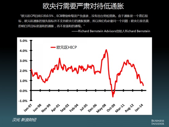 “歐元區CPI目前只有0.5%,ECB繼續收縮資產負債表,沒有出臺寬松措施。由于通脹是一個滯后指標,歐元區通脹的領先指標并不支持歐央行的通脹預測,所以我們有必要問一個問題:歐央行是否真的明白其目標是溫和的通脹,而不是溫和的通縮!薄猂ichard