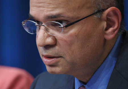 國際貨幣基金組織(IMF)9日發布的《財政監測報告》認為,新興市場經濟體和低收入國家的財政脆弱性在上升,盡管大部分情況下起始水平相對較低。IMF財政事務部門負責人桑吉夫·古普塔表示,新興經濟體總體而言財政狀況較為穩健,但目前面臨的環境更具挑戰性。報告建議,新興經濟體調動更多稅收資源,同時制定更為合理的支出優先安排。 圖為桑吉夫·古普塔9日在IMF華盛頓總部的發布會上講話。