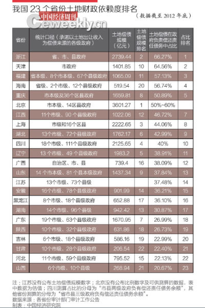 《報告》顯示,23個省份中,浙江省以66.27%排名第一;天津排名第二,64.56%。換句話說,浙江、天津兩地政府負有償還責任的債務,都有2/3的份額要靠賣地來償還。