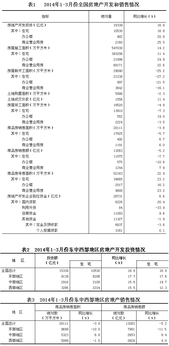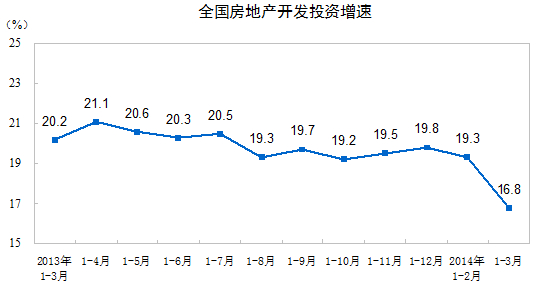 2014年1-3月份,全國房地產開發投資15339億元,同比名義增長16.8%(扣除價格因素實際增長15.5%),增速比1-2月份回落2.5個百分點。其中,住宅投資10530億元,增長16.8%,增速回落1.6個百分點,占房地產開發投資的比重為68.7%。