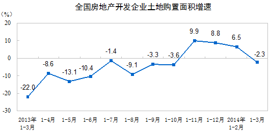 1-3月份,房地產開發企業土地購置面積5990萬平方米,同比下降2.3%,1-2月份為增長6.5%;土地成交價款1556億元,增長11.4%,增速提高2.5個百分點。