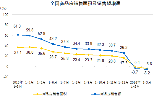 1-3月份,商品房銷售面積20111萬平方米,同比下降3.8%;降幅比1-2月份擴大3.7個百分點;其中,住宅銷售面積下降5.7%,辦公樓銷售面積增長6.7%,商業營業用房銷售面積增長6.0%。商品房銷售額13263億元,下降5.2%,降幅比1-2月份擴大1.5個百分點;其中,住宅銷售額下降7.7%,辦公樓銷售額下降10.6%,商業營業用房銷售額增長7.9%。