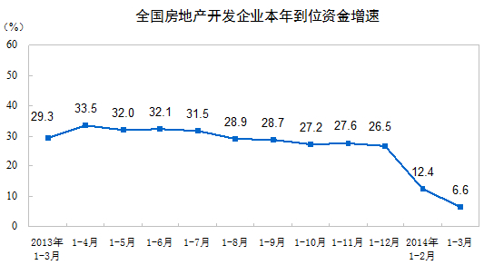 1-3月份,房地產開發企業到位資金28731億元,同比增長6.6%,增速比1-2月份回落5.8個百分點。其中,國內貸款6226億元,增長20.4%;利用外資84億元,下降33.9%;自籌資金11093億元,增長9.6%;其他資金11327億元,下降1.9%。在其他資金中,定金及預收款6837億元,下降3.6%;個人按揭貸款3161億元,增長0.1%。