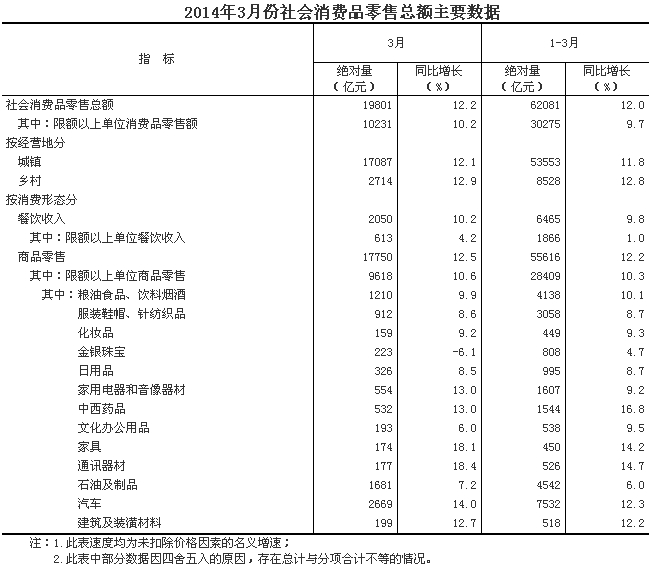2014年3月份,社會消費品零售總額19801億元,同比名義增長12.2%(扣除價格因素實際增長10.8%,以下除特殊說明外均為名義增長)。其中,限額以上單位消費品零售額10231億元,增長10.2%。1-3月份,社會消費品零售總額62081億元,同比增長12.0%。其中,限額以上單位網上零售額[1]815億元,增長51.7%。