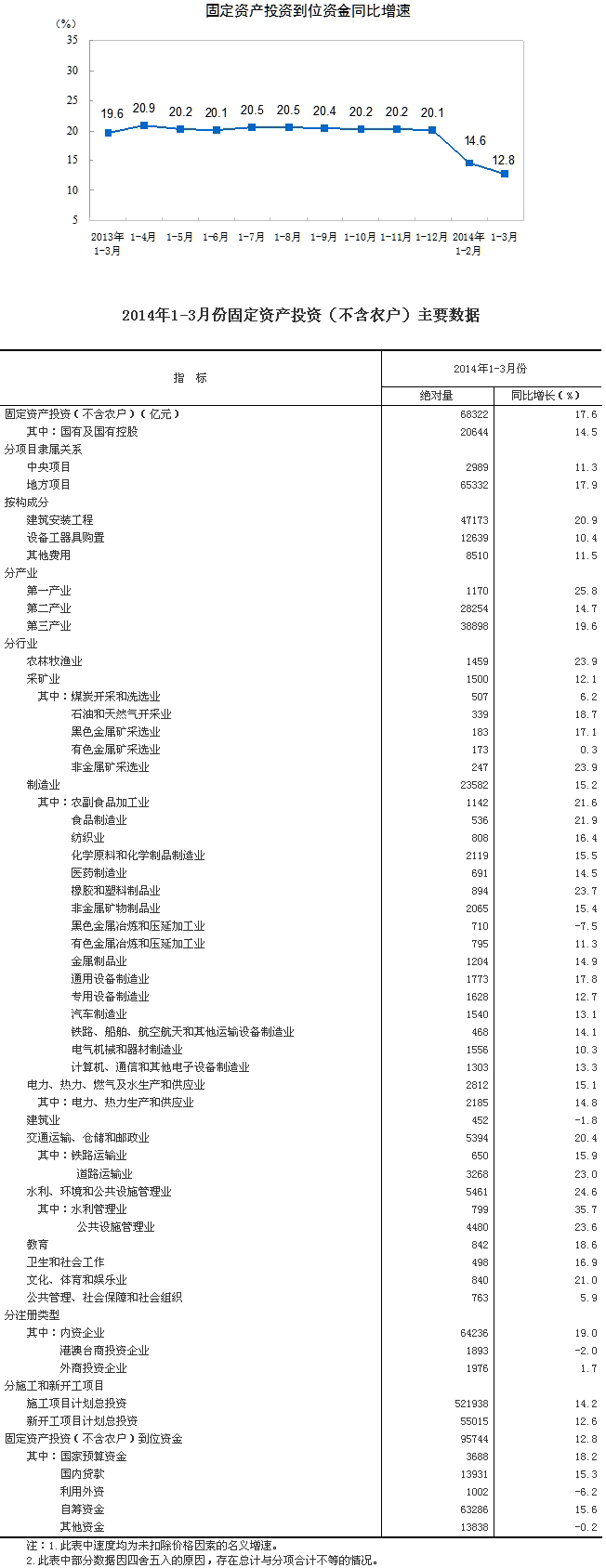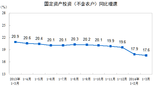 2014年1-3月份,全國固定資產投資(不含農戶)68322億元,同比名義增長17.6%(扣除價格因素實際增長16.3%),增速比1-2月份回落0.3個百分點。從環比速度看,3月份固定資產投資(不含農戶)增長1.24%。