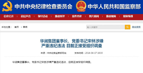 記者從中央紀委獲悉,華潤集團董事長、黨委書記宋林涉嫌嚴重違紀違法,目前正接受組織調查。