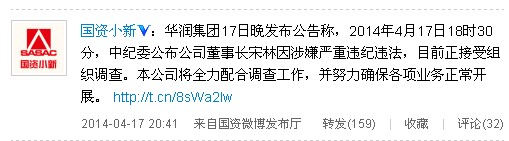 華潤集團17日晚發布公告稱,2014年4月17日18時30分,中紀委公布公司董事長宋林因涉嫌嚴重違紀違法,目前正接受組織調查。本公司將全力配合調查工作,并努力確保各項業務正常開展。