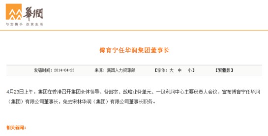 4月23日上午,集團在香港召開集團全體領導、各部室、戰略業務單元、一級利潤中心主要負責人會議,宣布傅育寧任華潤(集團)有限公司董事長,免去宋林華潤(集團)有限公司董事長職務。