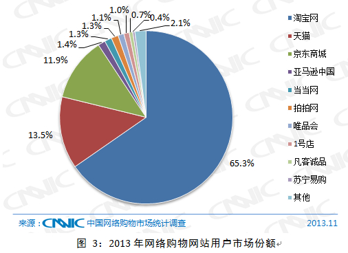 淘寶網、天貓、京東商城的用戶份額在網購市場排名前三,占據90.7%的用戶市場。其中,淘寶網占據65.3%的用戶市場份額,天貓占據13.5%的用戶市