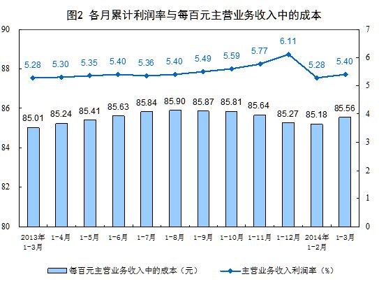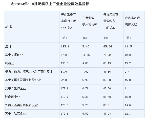 1-3月份,規模以上工業企業主營業務收入利潤率為5.4%,每百元主營業務收入中的成本為85.56元,每百元資產實現的主營業務收入為115.1元,產成品存貨周轉天數為14.5天。