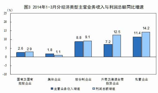 1-3月份,在規模以上工業企業中,國有及國有控股企業實現利潤總額3548.4億元,同比增長2.9%;集體企業實現利潤總額171億元,增長1.1%;股份制企業實現利潤總額7550.5億元,增長9.1%;外商及港澳臺商投資企業實現利潤總額3011.2億元,增長12.5%;私營企業實現利潤總額4191.4億元,增長14.2%。