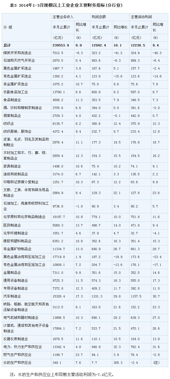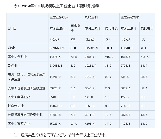 1-3月份,全國規模以上工業企業實現利潤總額12942.4億元,同比增長10.1%,增速比1-2月份提高0.7個百分點;實現主營活動利潤12238.5億元,同比增長9.4%,增速比1-2月份提高1個百分點。