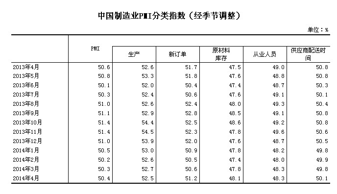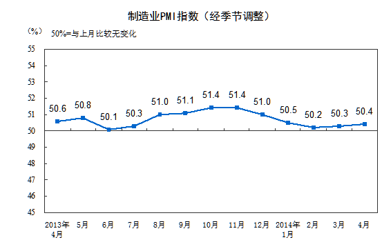 2014年4月,中國制造業采購經理指數(PMI)為50.4%,連續2個月微升0.1個百分點,預示我國制造業繼續保持平穩增長勢頭。
