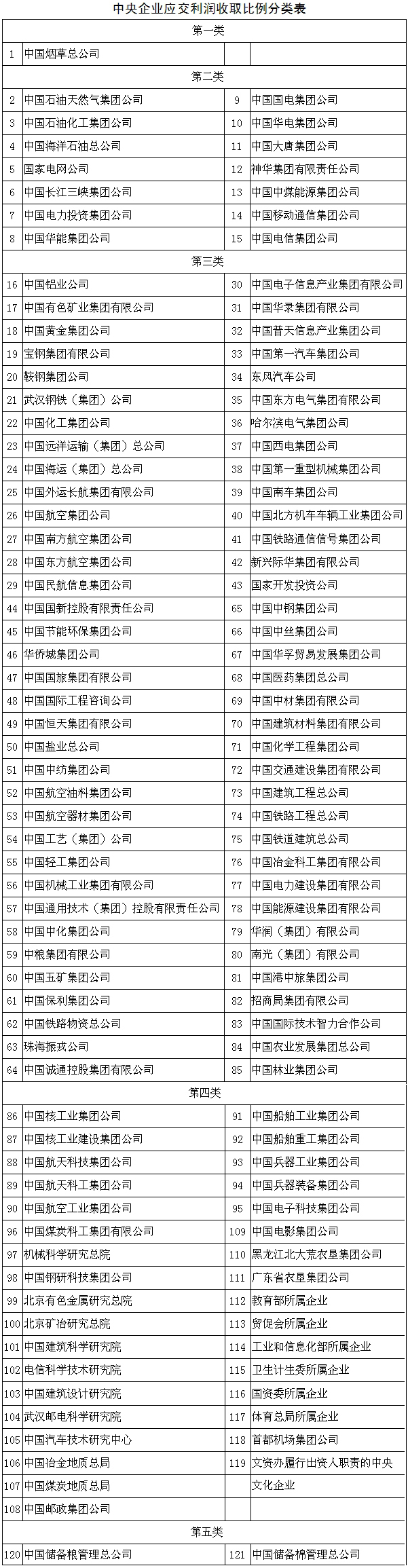 通知指出,國有獨資企業應交利潤收取比例在現有基礎上提高5個百分點,即:第一類企業為25%;第二類企業為20%;第三類企業為15%;第四類企業為10%;第五類企業免交當年應交利潤(企業分類名單詳見附件)。符合小型微型企業規定標準的國有獨資企業,應交利潤不足10萬元的,比照第五類企業,免交當年應交利潤。