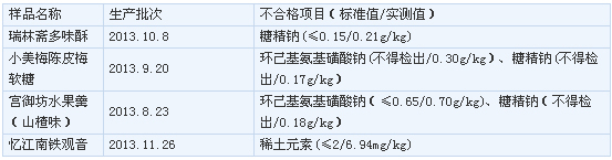 本次通報有“瑞林齋”牌多味酥等4種不合格食品表。其中,“小美梅”牌陳皮梅軟糖測出了甜蜜素和糖精鈉的成分。