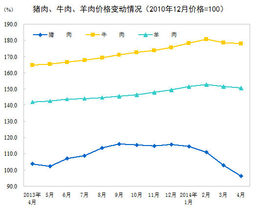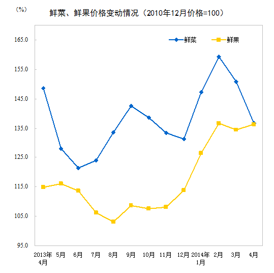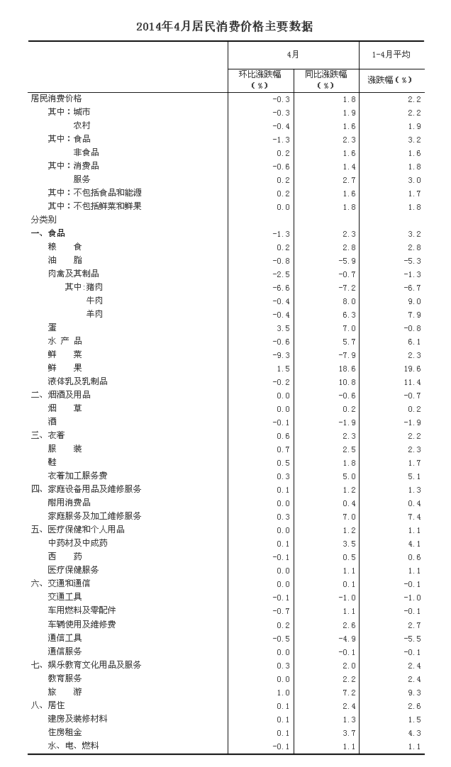 2014年4月份,全國居民消費價格總水平同比上漲1.8%。其中,城市上漲1.9%,農村上漲1.6%;食品價格上漲2.3%,非食品價格上漲1.6%;消費品價格上漲1.4%,服務價格上漲2.7%。1-4月平均,全國居民消費價格總水平比去年同期上漲2.2%。