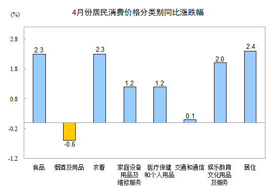 4月份,非食品價格環比上漲0.2%。其中,衣著、娛樂教育文化用品及服務、家庭設備用品及維修服務、居住價格分別上漲0.6%、0.3%、0.1%和0.1%;煙酒及用品、醫療保健和個人用品、交通和通信價格持平(漲跌幅度為0)。